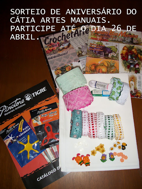 Amigas, amigos e visitantes do meu cantinho de artesanatos; meu Blog vai fazer 2 aninhos e estarei fazendo esse SORTEIO em comeração. Eu acredito que devo muito a todas vocês que me aceitaram como amiga, ou mesmo aquelas que só gostam do conteúdo do meu Blog. É com muito carinho que vou enviar para a ganhadora esses Mimos....não importa de onde você é.......meu sorteio é para quem quiser se inscrever mesmo que não more no Brasil. Não estou impondo nenhuma regra a única coisa é deixar seu nome, e-mail, país e cidade que mora.